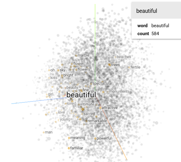 本教程包含对 词嵌入 (Word Embedding) 的介绍,我们将使用 Keras 训练自己的词嵌入模型,用于情绪分类任务,然后在 Embedding Projector 中将其可视化,如下图所示: